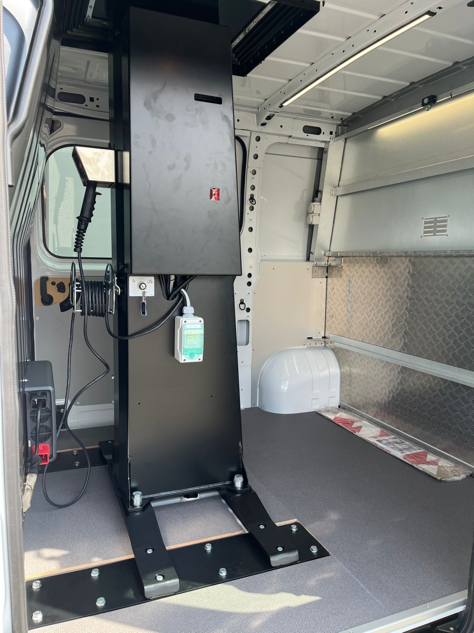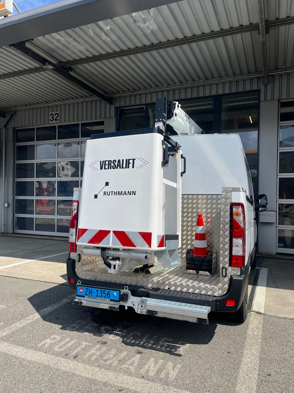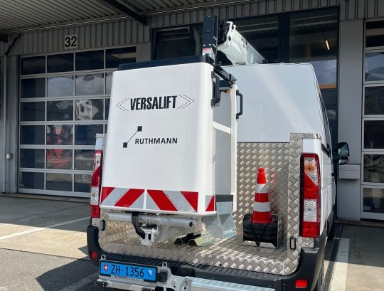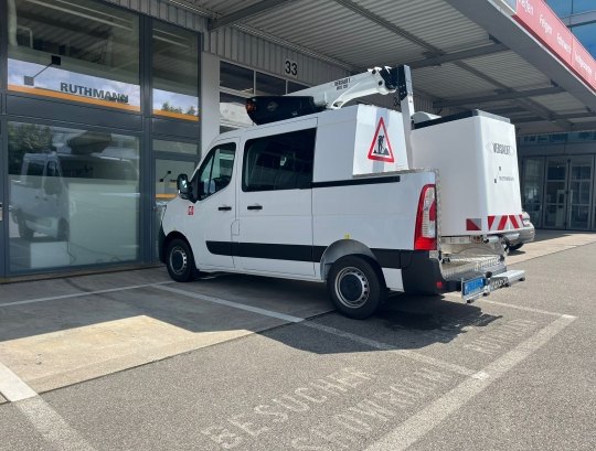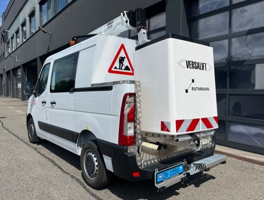Kompakte und wendige Hubarbeitsbühne mit 11.9 m Arbeitshöhe, 6,7 m seitlicher Reichweite und 120 kg Korblast. Aufgebaut auf einem kurzen 3.1 t Renault Master mit Ausschnitt hinten, (Länge: 5.26 m / Höhe: 2.8 m). Diese Maschine ermöglicht maximale Flexibilität bei beengten Platzverhältnissen. Die Maschine ist extrem wendig und schnell aufgestellt, weil ohne Abstützung. Ideal für vielseitige Einsätze.